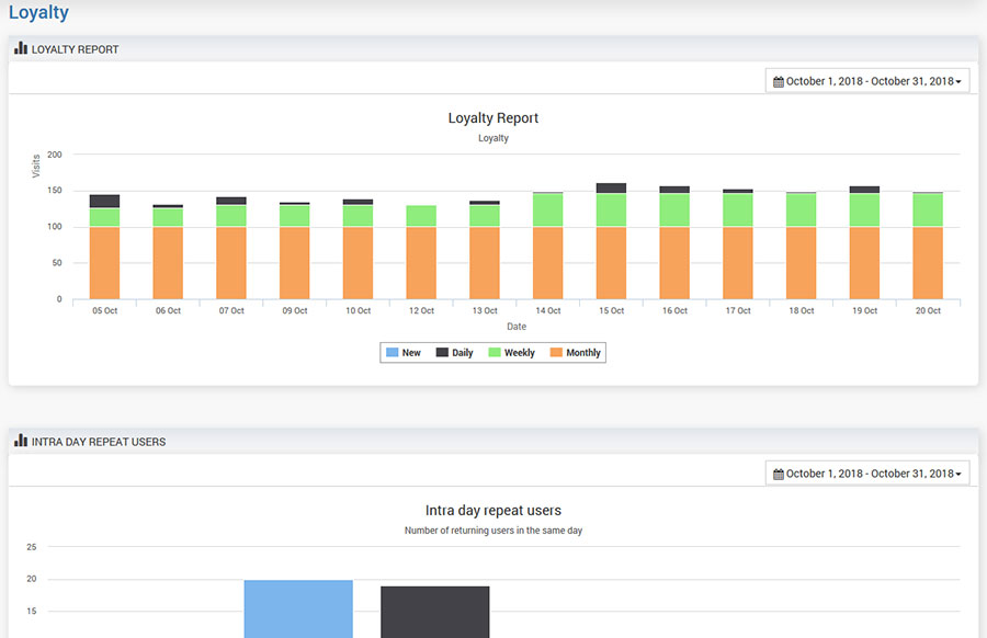 Loyalty Report and Intra Day Repeat Users give information per day and can be filtered based on time intervals.