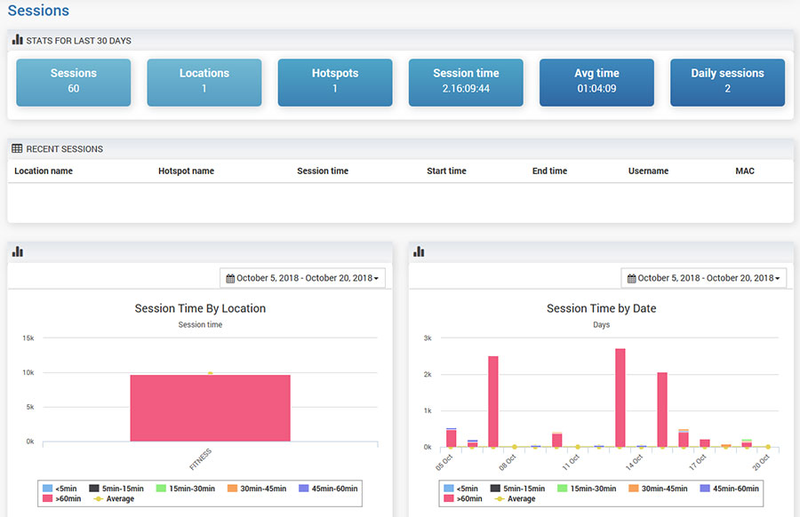 Recent Sessions panel show last 10 started sessions with details for a Location name, Hotspot Name, Session Time, Start Time, End Time, Username and MAC address.