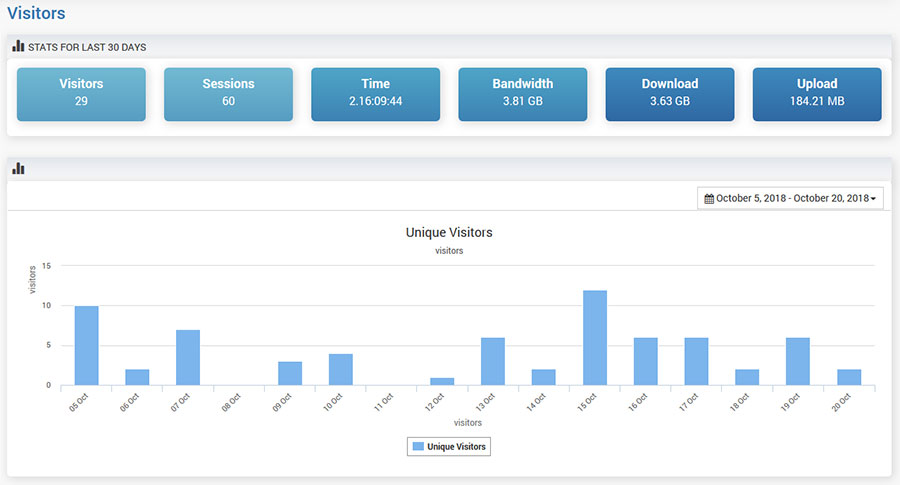 Visitors panel shows the number of Visitors, Sessions, Time of use, used Bandwidth, Download and Upload quota.