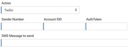 Twilio action requires to type Sender Number, Account SID, AuthToken and SMS message to send.