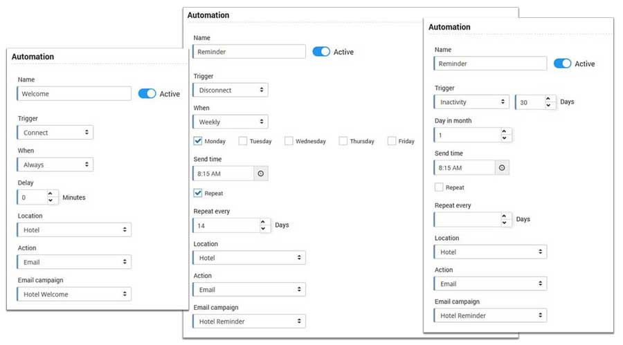 Email campaigns can be sent when necessary, if you want to inform your guests about the novelties, or automatically according to a previously defined schedule which includes initial connection, inactivity or on a guest’s birthday.