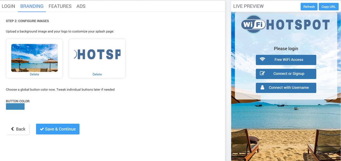 Upload a background image and a logo to customize the splash page.