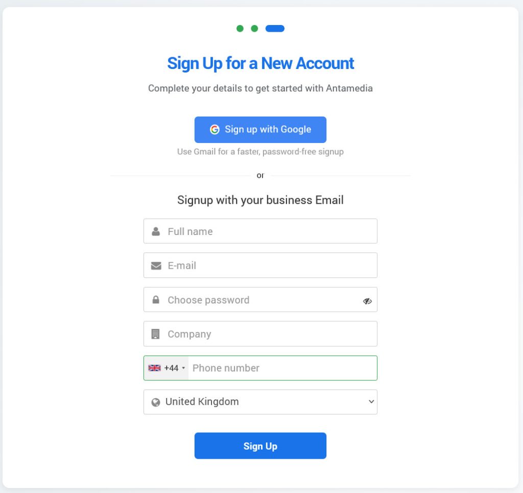Sign Up and basic configuration of your account on Antamedia Cloud Platform is done in couple easy steps.