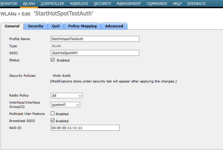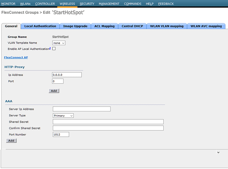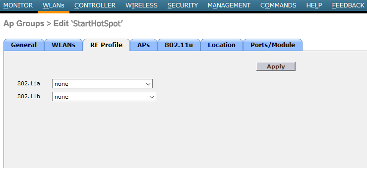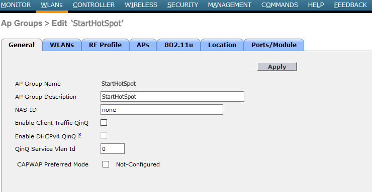 From General tab specify AP Group Description StartHotSpot.
