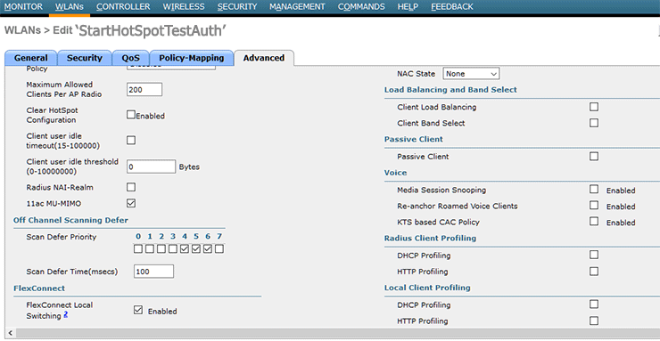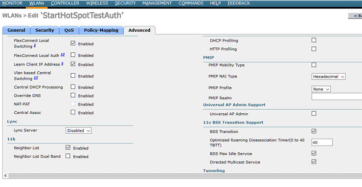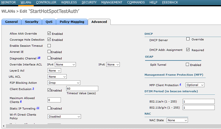 From Advanced tab be sure that Allow AAA Override and and Coverage Hole Detection are Enabled.