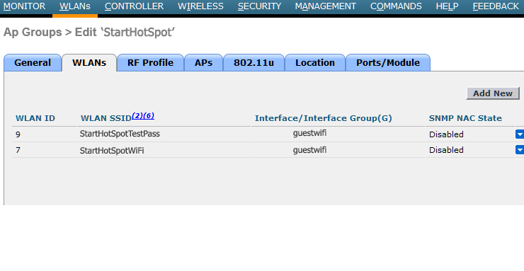 Go to WLANs section and in Ap Groups choose to edit StartHotSpot Group.