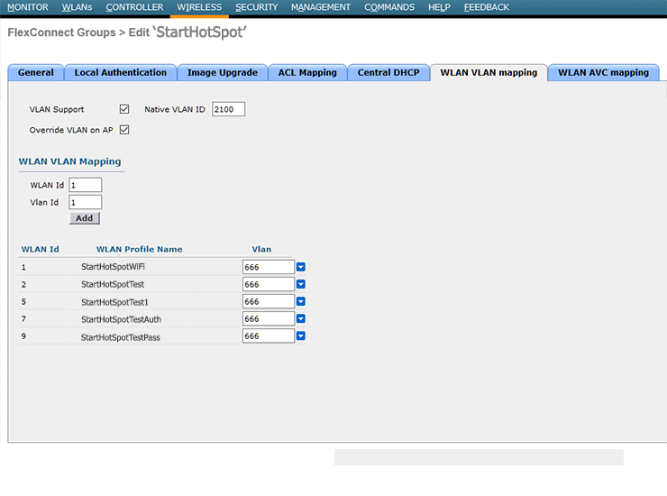 From WLAN VLAN mapping tab select to use VLAN Support, Override LAN on AP and set Native VLAN ID 2100.