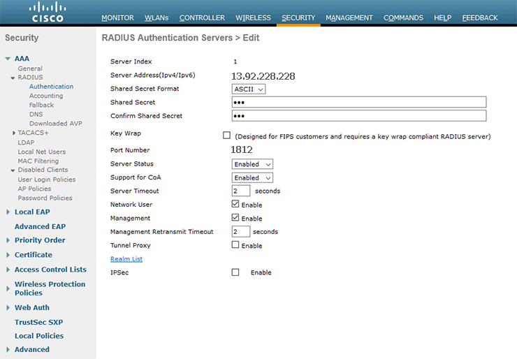 Authentication Servers should be Enabled and set IP: 13.92.228.228, Port:1812
