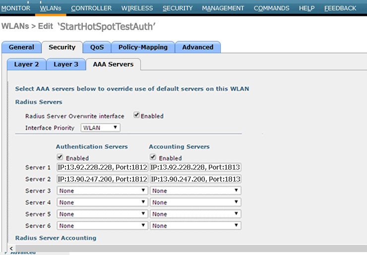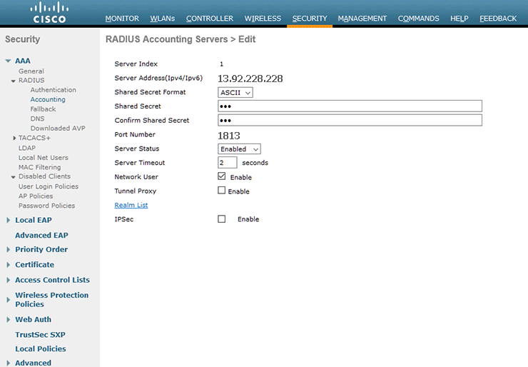 Accounting Servers should be Enabled and set IP: 13.92.228.228, Port:1813