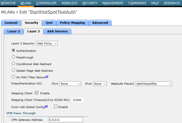 From Security / Layer 3 tab as Layer 3 Security set Web Policy and activate Authentication.