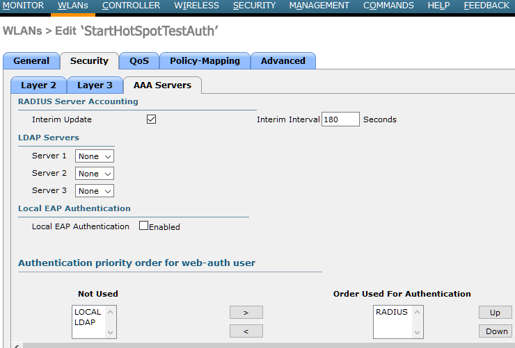From AAA Servers tab as Radius Server Overwrite interface select Enabled and set WLAN from Interface Priority.