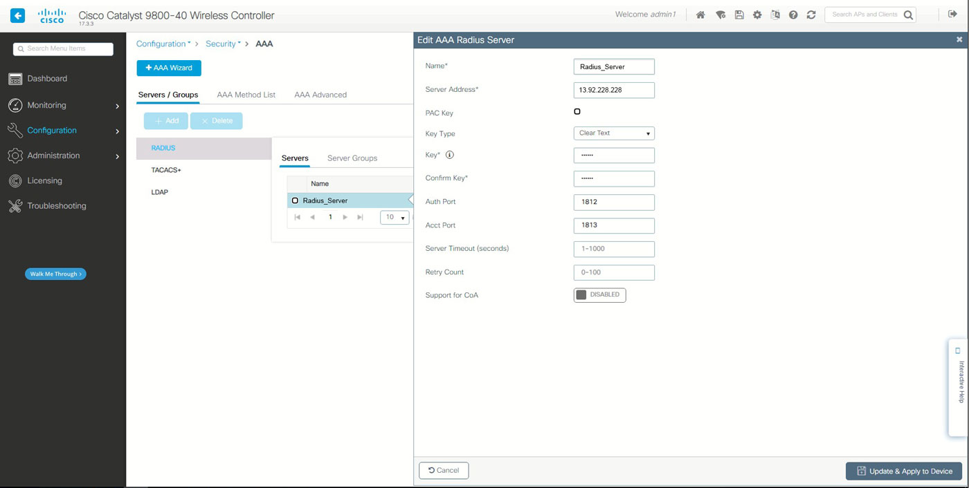 Log in to your Cisco Controller, go to the Configuration/ Security / AAA page.