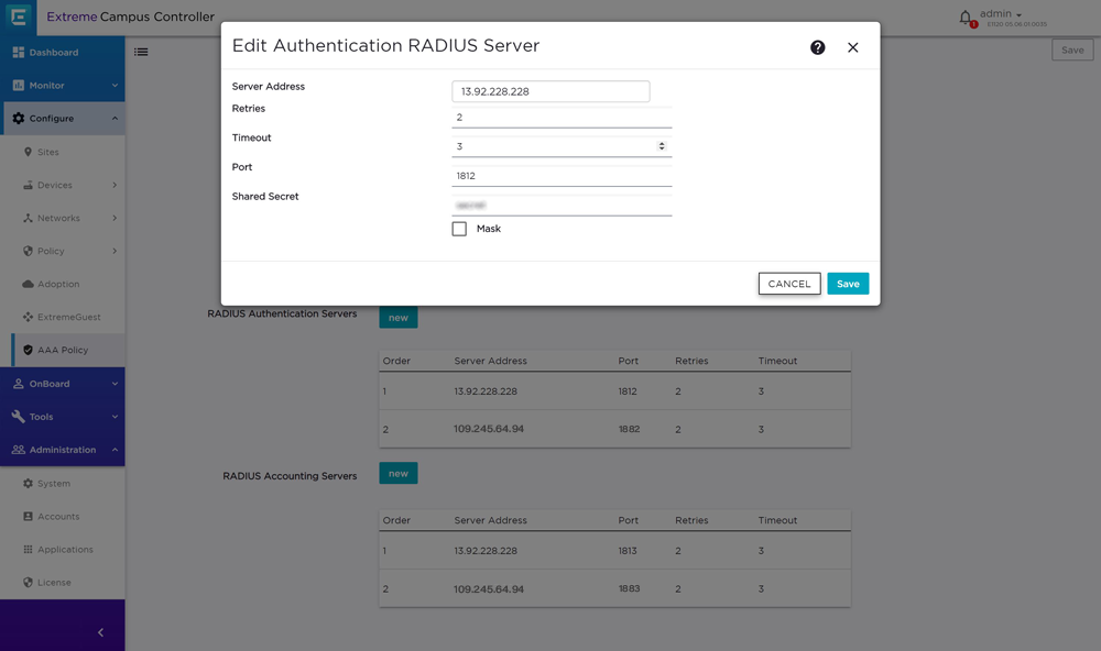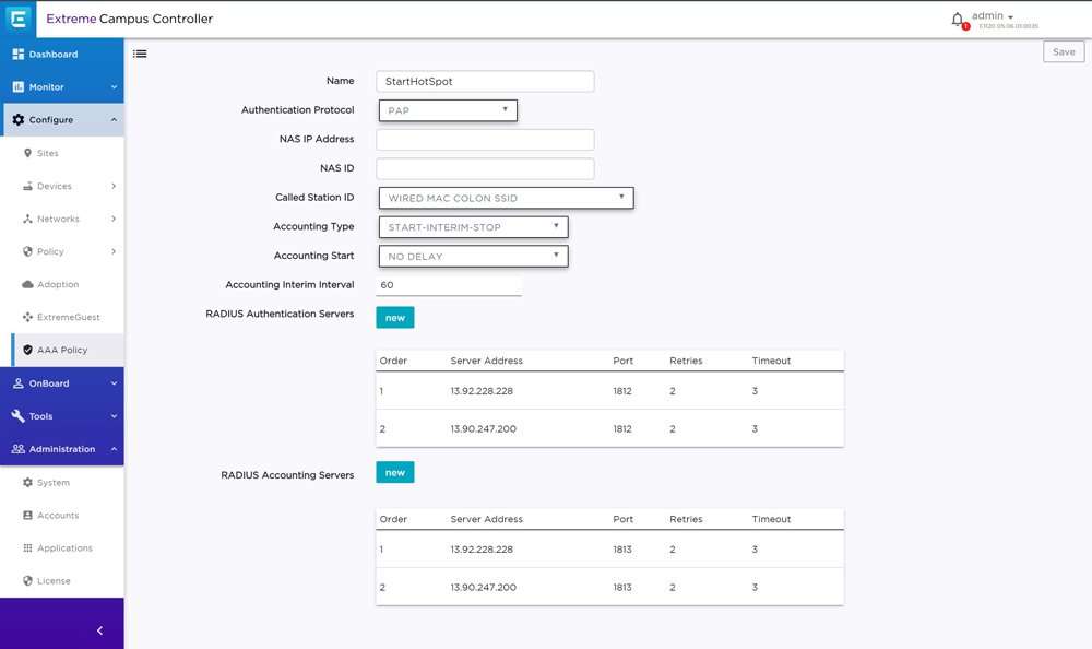 Log in to your Extreme Networks Campus Controller, go to Configure/AAA Policy page and configure following: