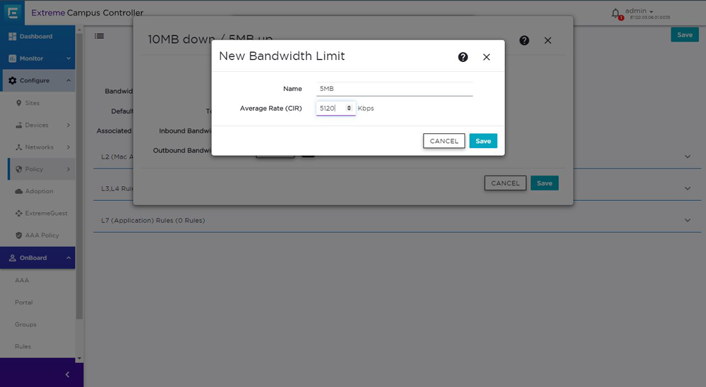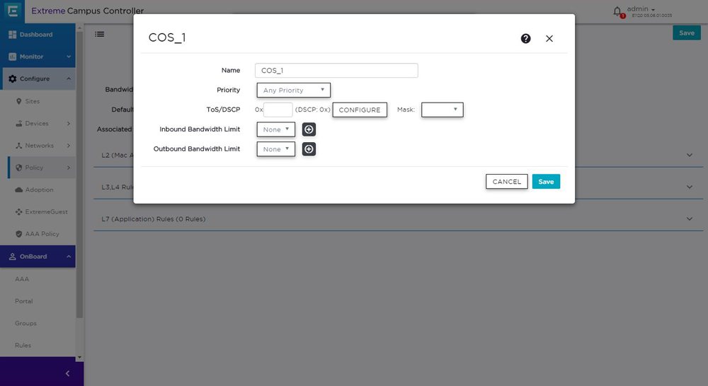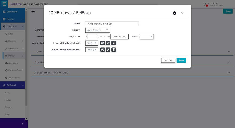 From the next window set CoS name ( in our case 10MB down / 5 MB up), select Any Priority, then configure Inbound Bandwidth and Outbound Bandwidth Limits.