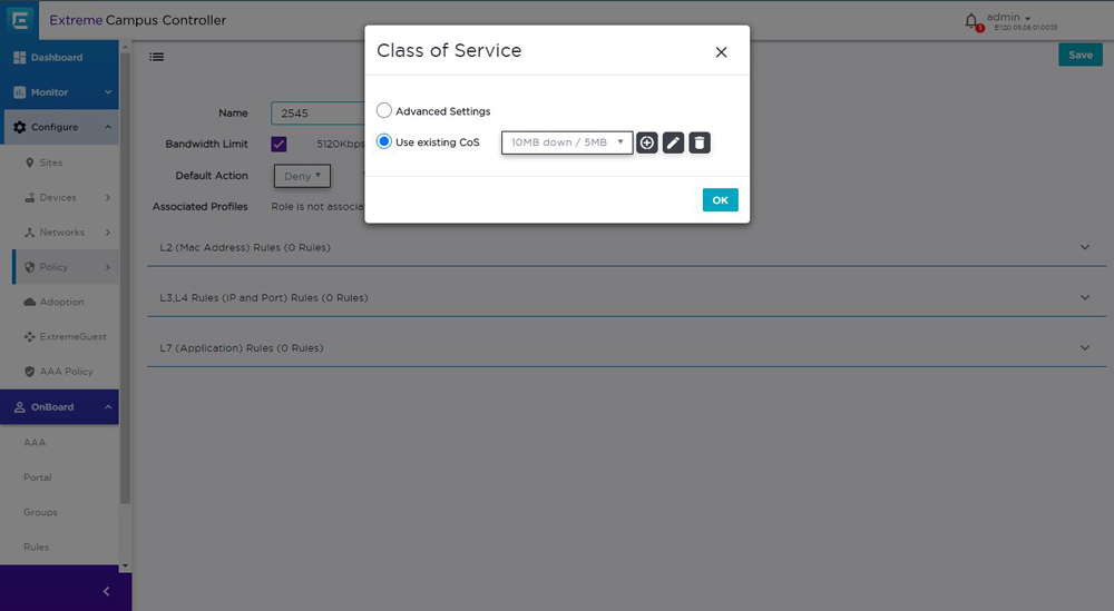 From the Class of Service pop up window select Use existing CoS and click + icon