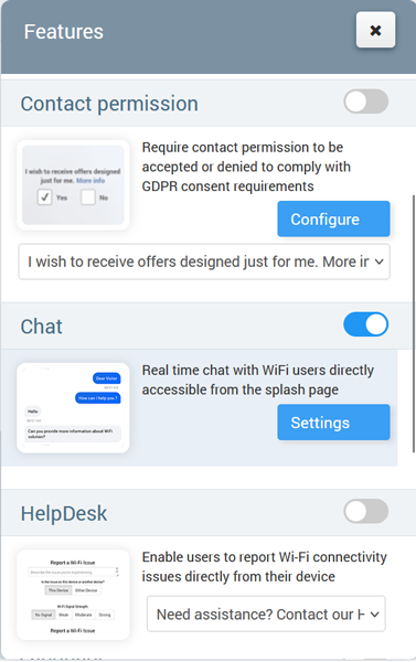 From Features panel in a couple of clicks can be enabled Terms of Use, Contact Permission, Chat, Help desk, Survey, Language and added to your Splash page.
