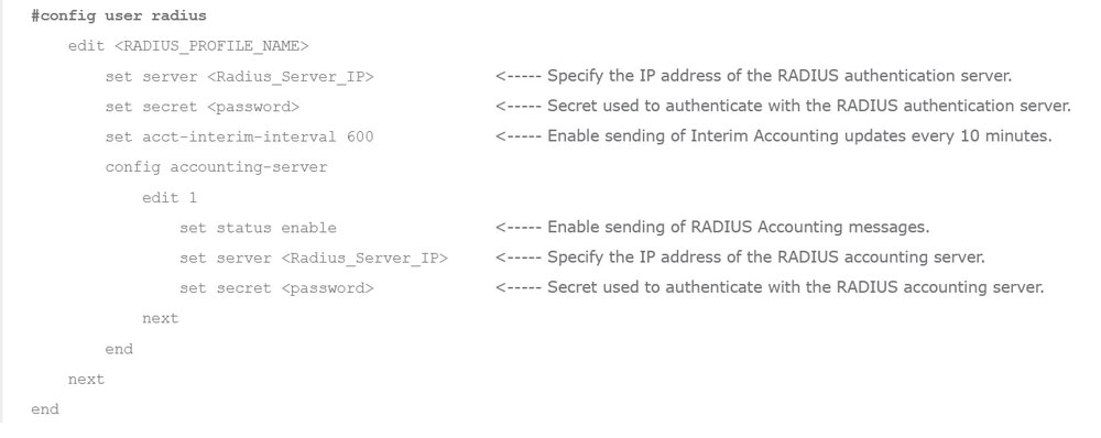 Configure FortiGate to send RADIUS Accounting: