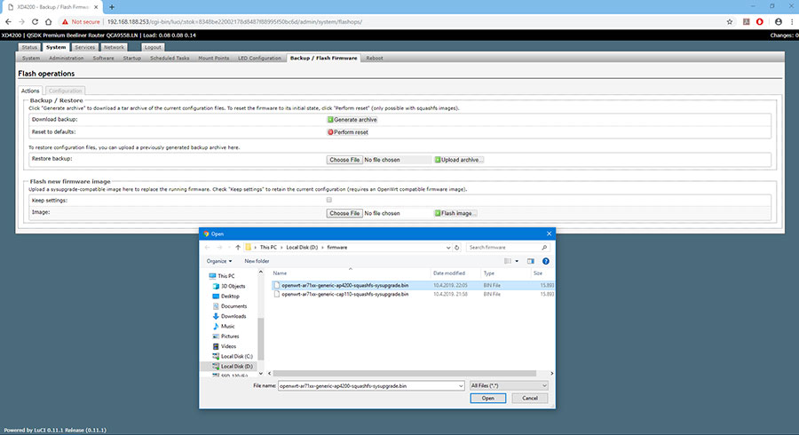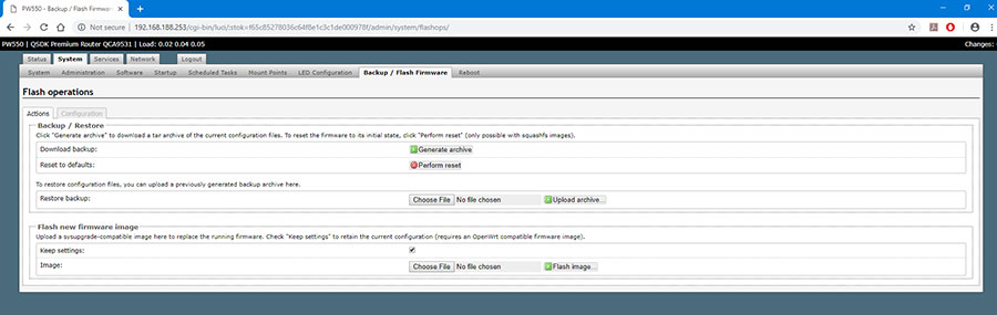 In the Flash new firmware image section, untick Keep settings option and click Choose File button.
