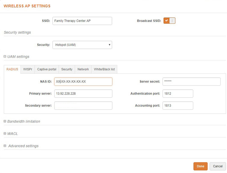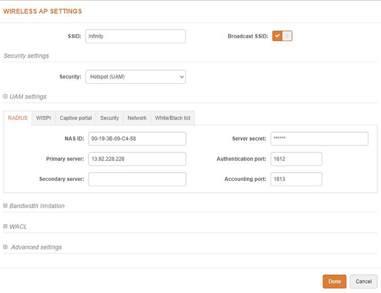 In Security Settings select Network SSID“HotSpot (UAM)”.