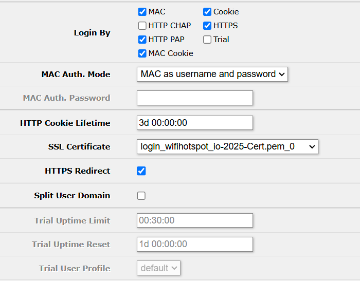 Open the Login tab and enable the MAC, Cookie, HTTPS, HTTP PAP, MAC Cookie checkbox.