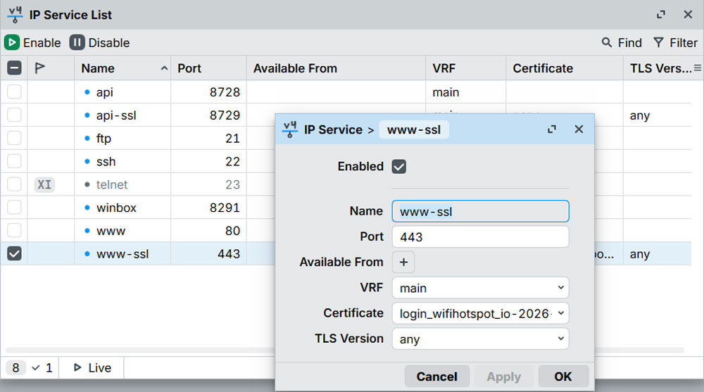 Open IP – Services option. Make sure that SSL is enabled, set port 443, and select your certificate in the Certificate dropdown menu.