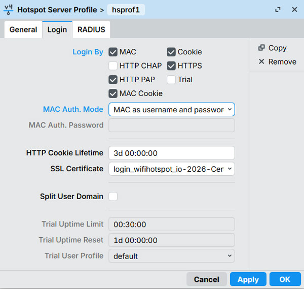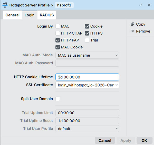 Open IP – Hotspot – Server profiles tab and select hsprof1 profile. In the General tab set the certificate domain address in the DNS Name field.