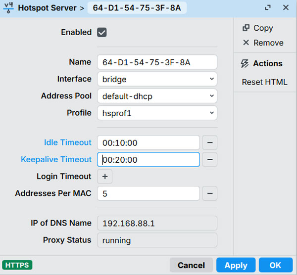 Double click on the created hotspot. Change the hotspot server Name to the MAC address of your Mikrotik WAN interface and press OK.