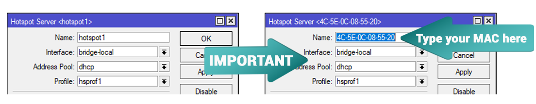 IMPORTANT:Usually as a Name is written hotspot1, change it to WAN MAC in format 00-00-00-00-00-00