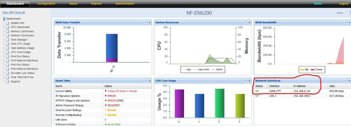 9. Click on “Dashboard” to check whether the ISP link came up and working in the firewall