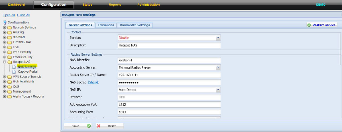 NAS: Server Settings Radius Server Settings