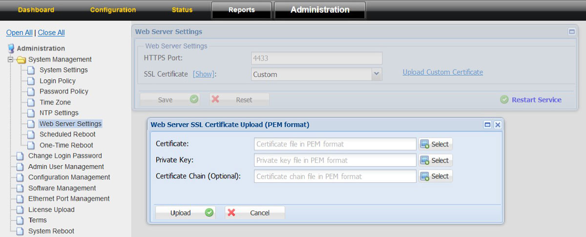 2. Choose System Management option in the left tree 3. Click on Web Server Settings 4. Click on “Upload Customer Certificate”