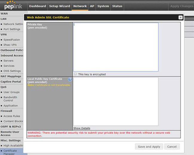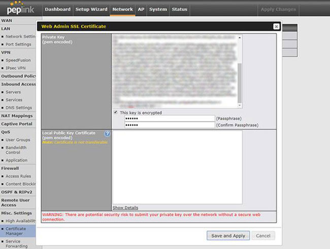 Click Save and Apply button to upload the private key and self-signed certificate to the Peplink router.