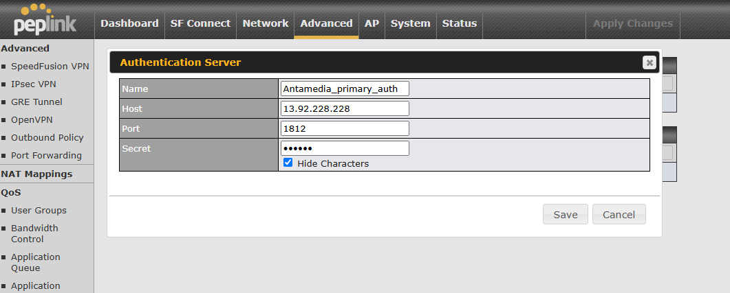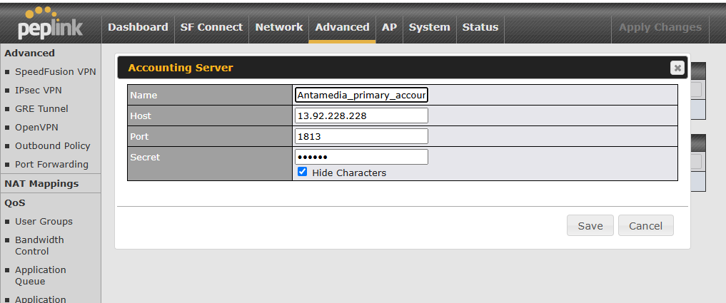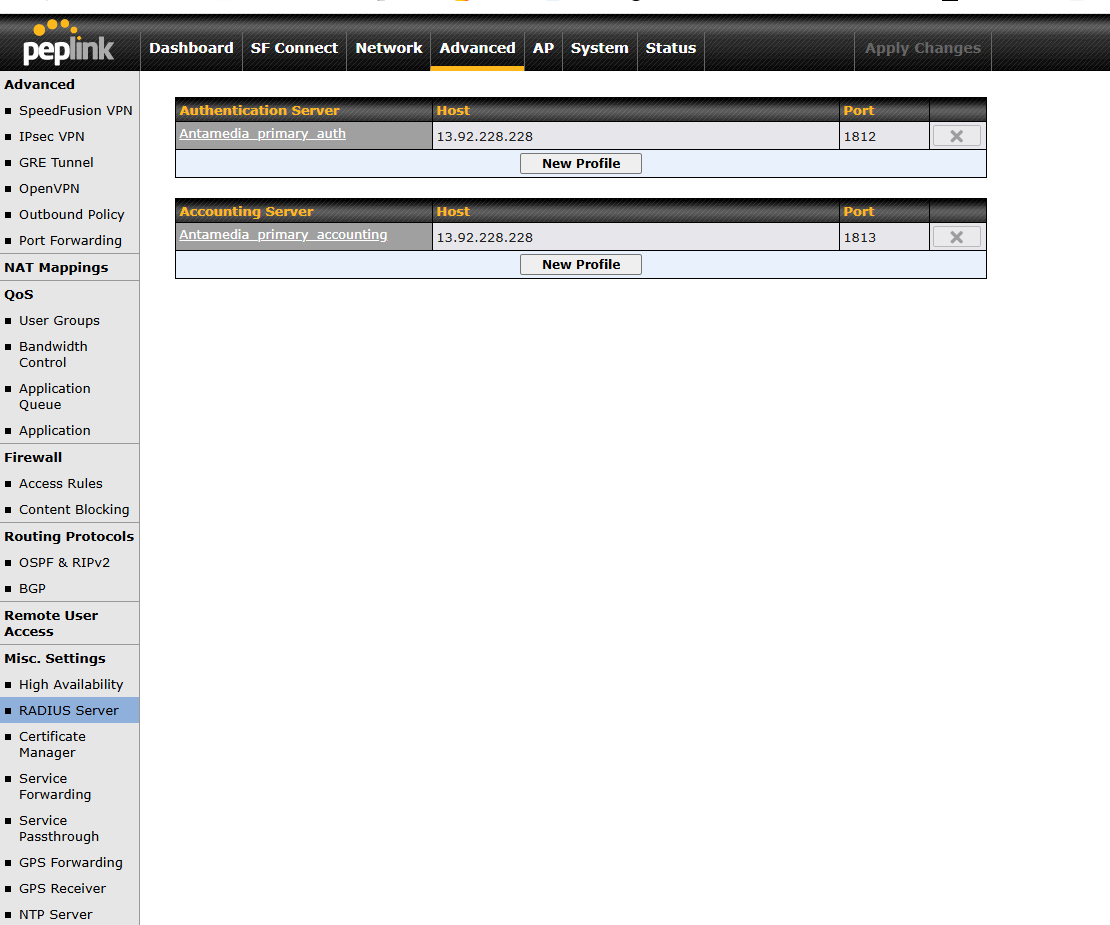 Go to: Advanced > Misc Settings > RADIUS Server to set up both Accounting and Authentication RADIUS servers.