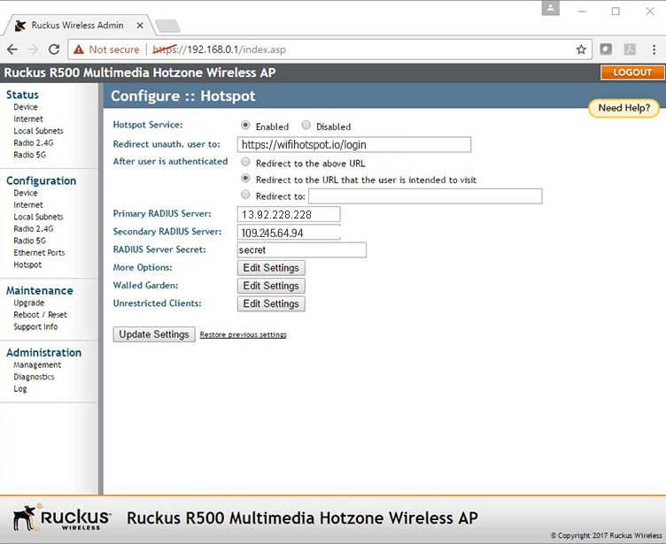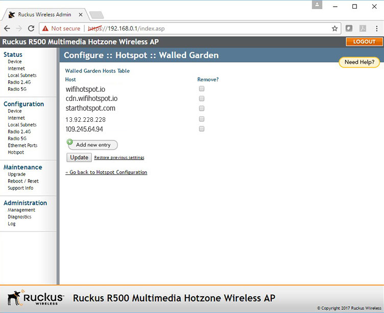 Go back to Configuration :: Hotspot section and click Walled Garden: Edit Settings button.