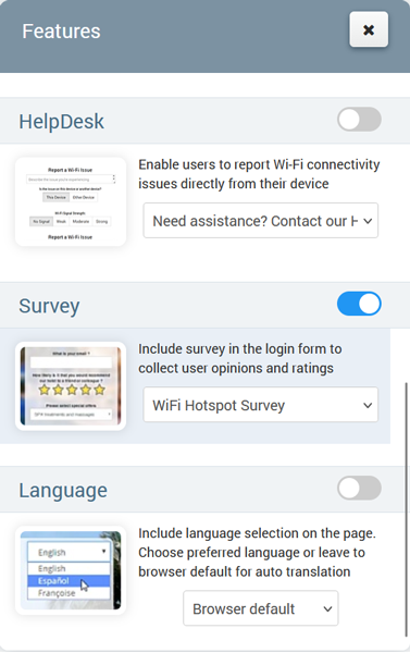 From the Splash page panel go to the Features section, select and add the desired feature, in this case Survey.