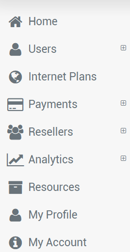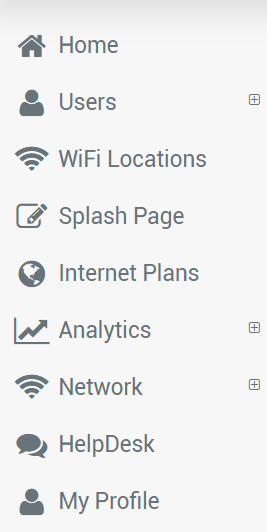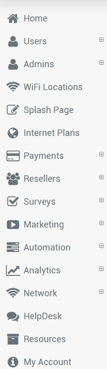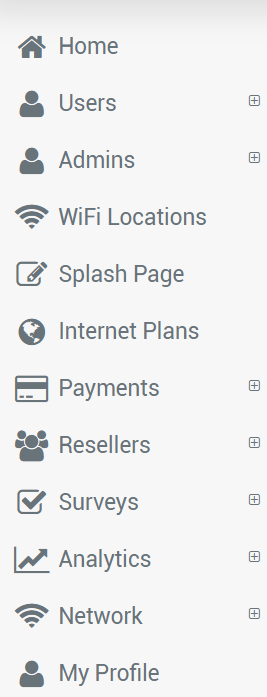 As Supervisor Admin you can access and create Users, Admins,WiFi locations, Splash page, Internet plans, Payments, Surveys, Analytics, Network.