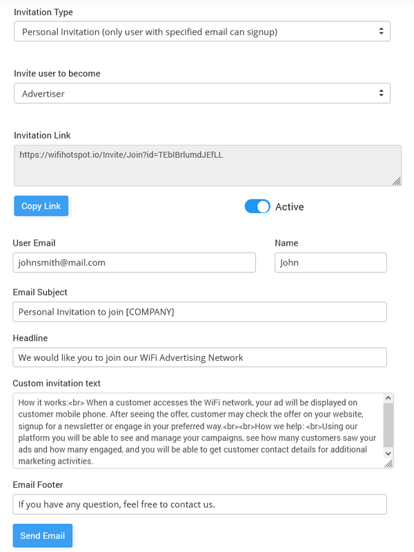 Type User Email, Name, Email subject, Headline, Custom invitation text, and Email Footer.