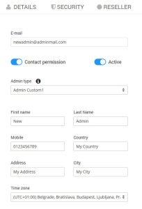 On the Admins page, Details tab type Email, set Password, select Admin type, and set other requested details.