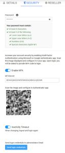On the Security tab, type Admin Password, optionally Enable MFA, and Inactivity Timeout.