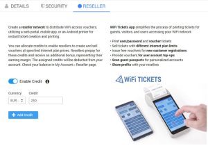 On the Reseller tab, you can allocate credits to enable resellers to create and sell vouchers at specified Internet plan prices. Resellers prepay for these credits and receive an additional bonus, representing their earning margin.