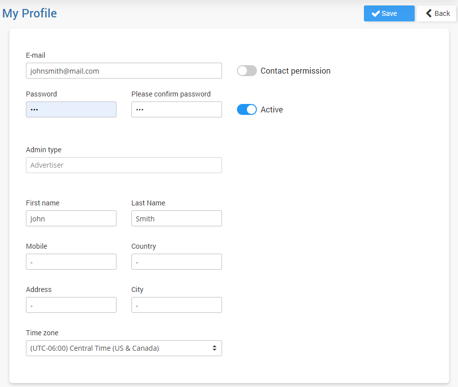 When the user logs in as admin, he can edit details from the self-service My profile page.