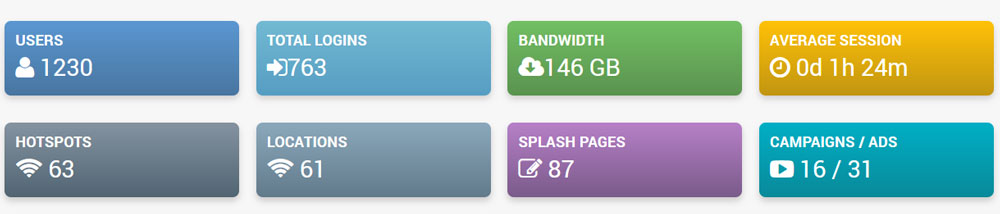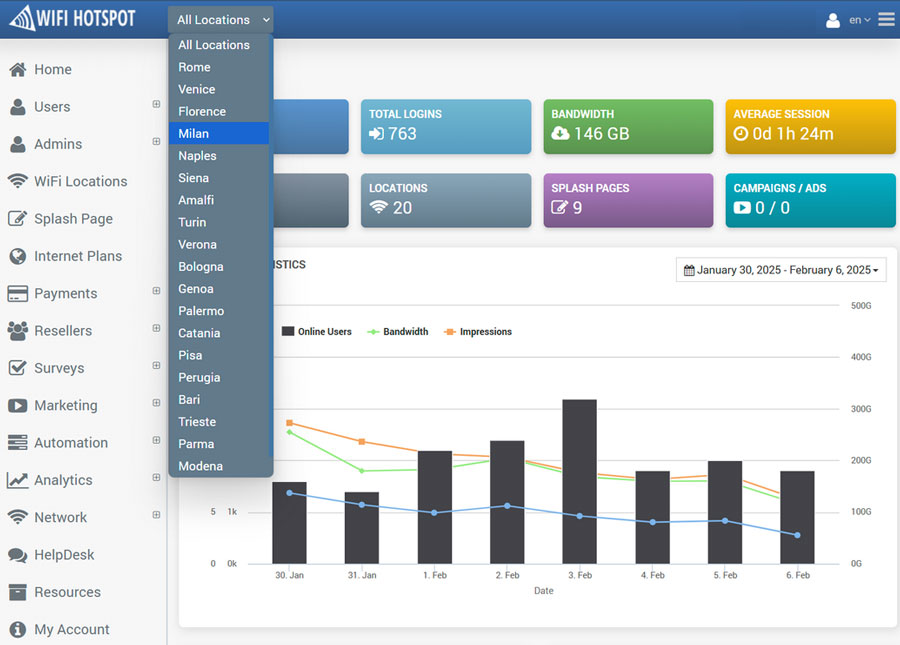 Administrators can view key data such as total logins, bandwidth usage, average session time, number of locations, splash pages, and ad campaigns. A built-in Location filter allows viewing statistics for specific hotspots, instantly updating charts and metrics. The dashboard also includes a date range selector and dynamic graphs for tracking user activity, bandwidth trends, and impressions, helping admins monitor network usage and make data-driven decisions quickly.