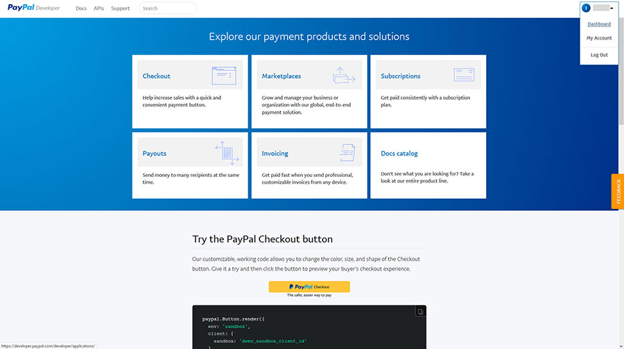 1. Login to https://developer.paypal.com using your PayPal account credentials.