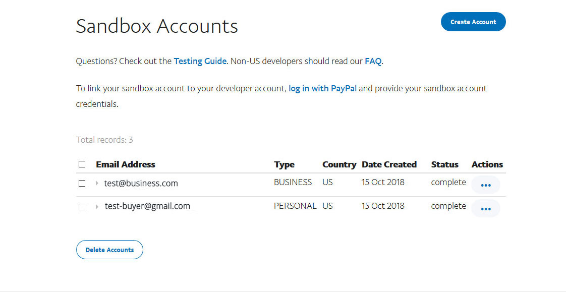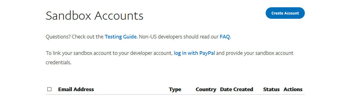 3. Under the Sandbox section click the Accounts link and click the Create Account button