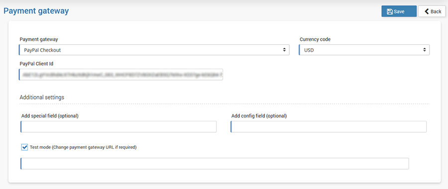 From Payment Gateway list select PayPal Checkout, set Currency Code, type PayPal Client ID, save changes and test.