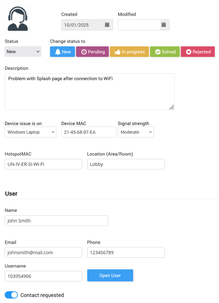 Once submitted, reports are sent to the administrator’s Help Desk panel inside the Cloud WiFi portal, where they can be reviewed, assigned a status, and resolved.