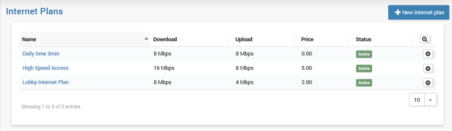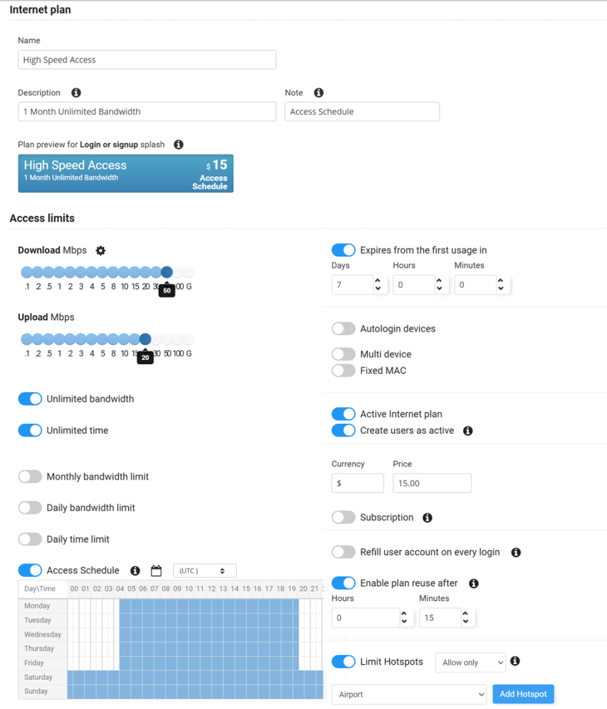 Internet plan determines which download and upload speed the guest will have during the session, total bandwidth data available for transfer, optional session duration, as well as the optional expiration date.
