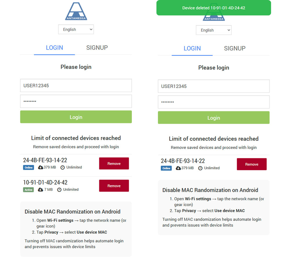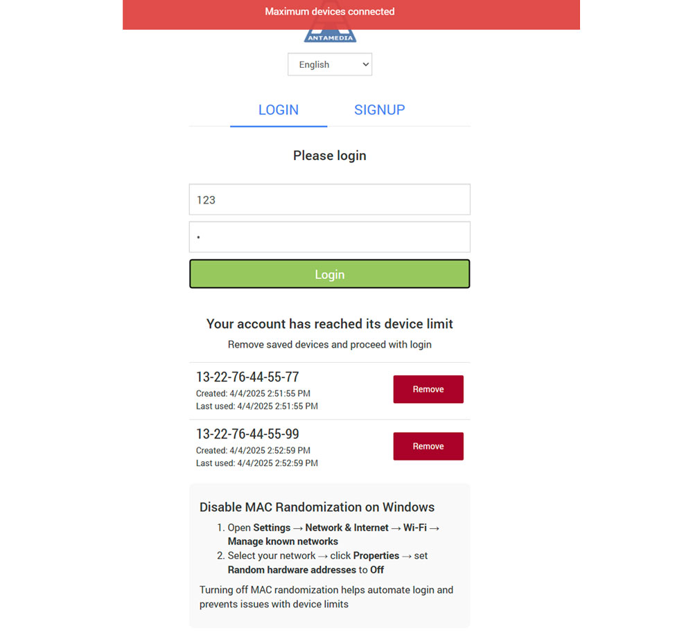 When a user hits the device limit, they are prompted to remove a saved device to continue. The interface shows a list of previously connected devices with timestamps and a “Remove” button next to each. Users can simply click “Remove” to free up a slot. To prevent future issues, the screen also displays easy-to-follow steps for disabling MAC randomization on Windows, with similar guides available for Android and iOS. This setup ensures users can maintain stable logins, especially in environments like ships where MAC changes are frequent.