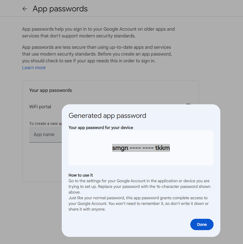 Go to your Google account, open Security, and search for App Passwords.