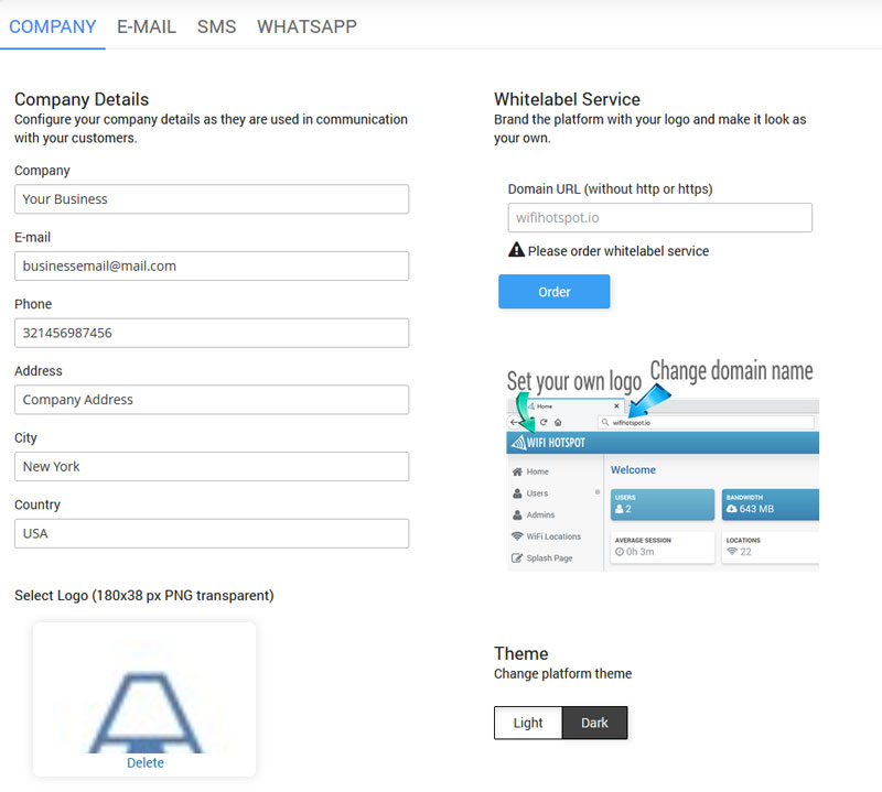 You have the ability to set your Company name, E-mail, Phone, Address, City, Country, and set logo.